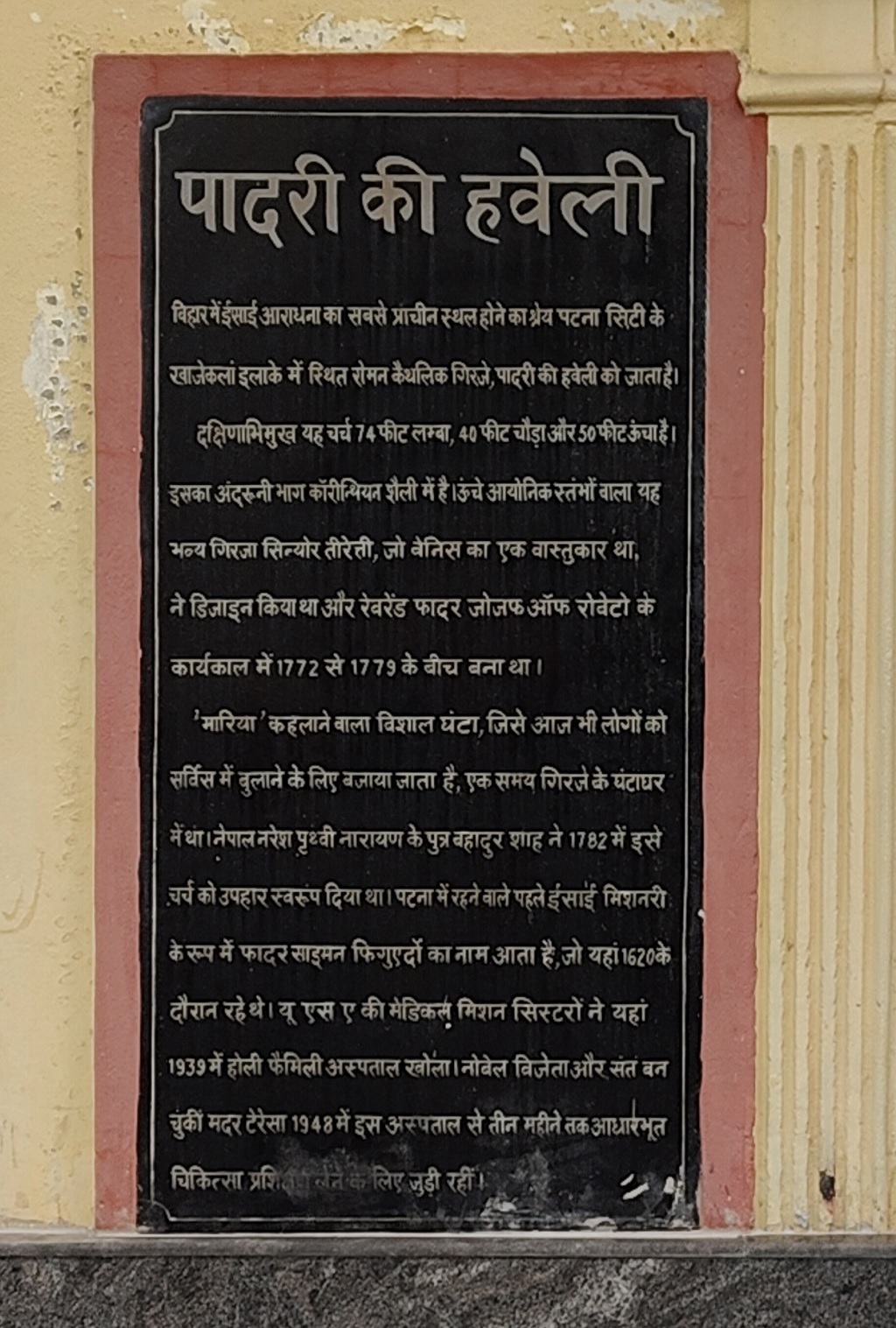 The credit for being the oldest place of Christian worship in Bihar goes to the Roman Catholic Church, Padri Ki Haveli, located in the Khajekalan area of Patna City. This church, facing south, is 74 feet long, 40 feet wide, and 50 feet high. Its interior is in Corinthian style. This magnificent church with high Ionic pillars was designed by Sinyor Tirreto, a Venetian architect, and was built between 1772 and 1779 during the tenure of Reverend Father Joseph of Roveto.
