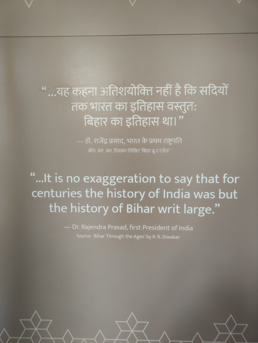 20 12 2025 50Views 0Likes 0Comments Bihar, Patna Posted By tushar Dr. Rajendra Prasad (First President of India) Quote on Bihar – This photo was taken at the Bihar Museum in Patna (Bihar). Related posts: Distance from Patna to Bodhgaya and Various Places History of Gurudwara Gobind Ghat (Kangan Ghat) The Martyrdom of Mahatma Gandhi – An Eyewitness’ Account Popular Posts: Bharat Ratna Pt. G. B. Pant High Altitude Zoo – 2020 m. Approx. History of Khusru Bagh (in Hindi) Bharuch’s Roasted Salted Peanuts – How much I Paid to the Vendor on the Train? Popular Tags: VrindavanRishikeshShirdi