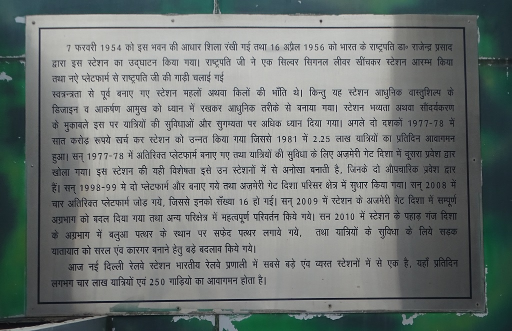 The stations built before independence were like palaces or forts. But this station was built in a modern way, keeping in mind the design and attractiveness of modern architecture. The focus was more on passenger amenities and accessibility than station grandeur or beautification. In the next two decades, in 1977-78, seven crore rupees were spent and the station was upgraded, due to which in 1981 there was a daily traffic of 2.25 lakh passengers. In the year 1977-78, additional platforms were built and a second entrance was opened in the Ajmeri Gate direction for the convenience of the passengers. This feature of this station makes it unique among those stations which have two formal entrances. In the year 1998-99, two more platforms were built, and the Ajmeri Gate direction complex area was improved. In the year 2008, four additional platforms were added, which increased the number to 16. In the year 2009, the entire façade was changed in the Ajmeri Gate direction of the station, and significant changes were made in other areas. In the year 2010, in the Paharganj direction of the stations, white stones were installed in place of sandstone, and major changes were made to make the road traffic simple and efficient for the convenience of the passengers.