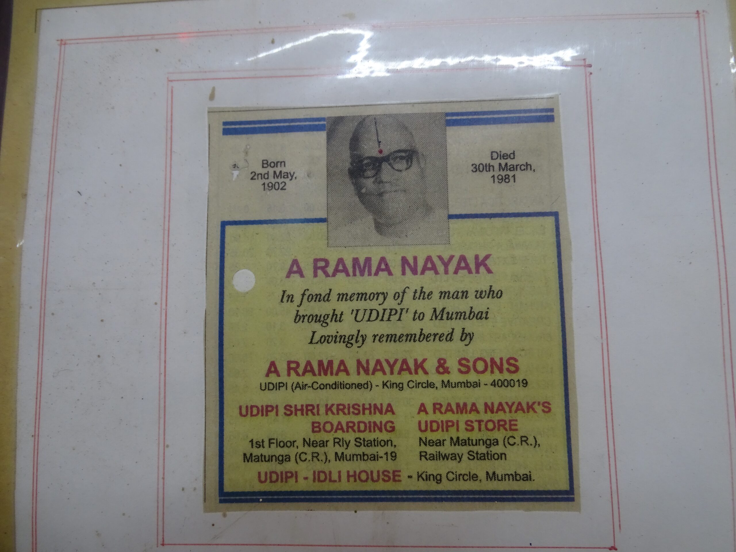 A. Rama Nayak (born: 02nd May 1902) at the age of 11 years sailed from Mangalore to Mumbai leaving his village Akkar, nearby Mangalore in Karnataka (known as Madras province during those days), and settled down in Santacruz, Mumbai. He started doing jobs in a couple of Mumbai restaurants and finally in 1942 decided to open his own restaurant because he saw – you can get omelet pav, vada pav, and misal pav but hardly one can get sambar rice especially if the tourist is from South-India. Thus, he started South Indian food at this very location by serving on a banana leaf.