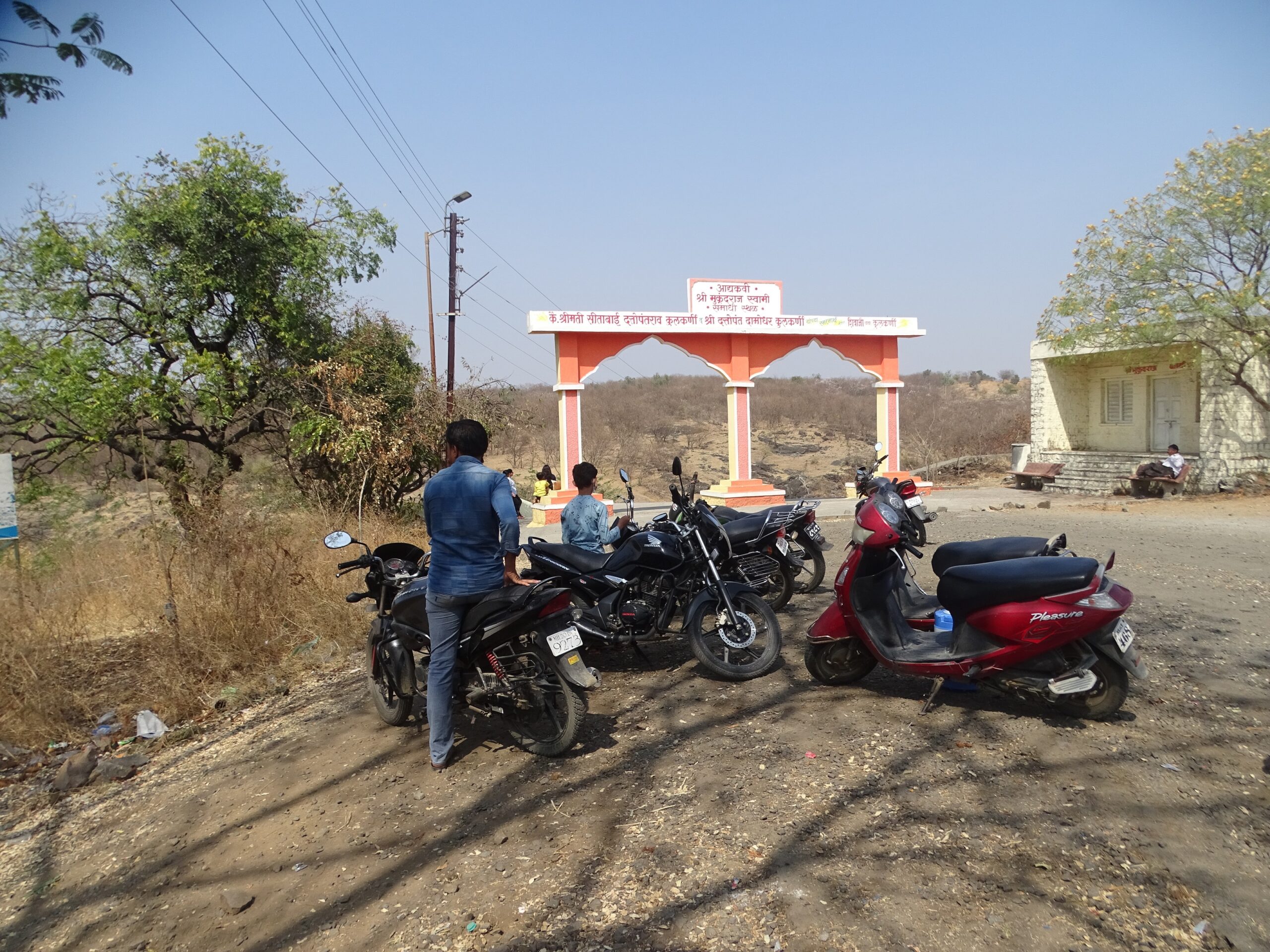 I, from Yogeshwari Yatri Niwas (approx. 1 km from Ambajogai Bus Depot) reach Adyakavi Shri Mukundraj Swami Samadhi Sthal as a pillion rider via Pravin’s motorbike – a farmer from Ambajogai but was told by a local person present at the samadhi sthal that State Transport bus from Ambajogai Bus Depot is available for Adyakavi Shri Mukundraj Swami Samadhi Sthal or one can hire an entire auto to reach.