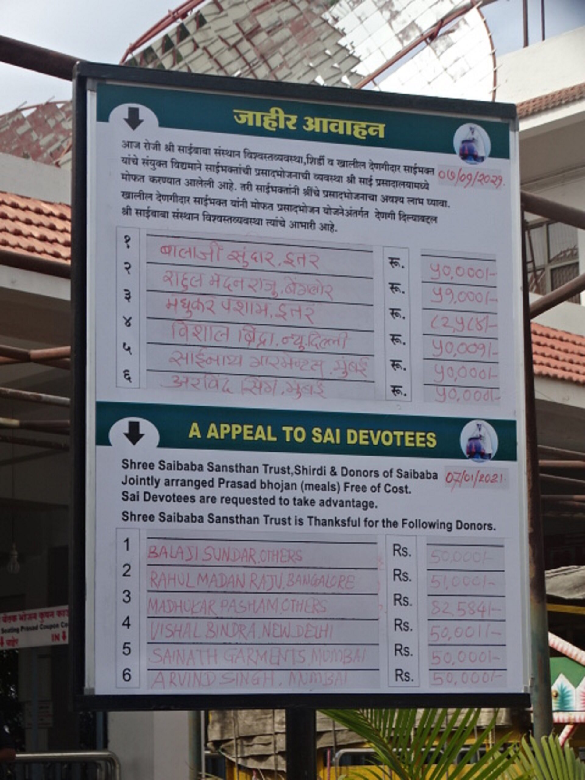 Shree Sai Prasadalay, Sale of Prasad Meals Coupon Time: 9:30 am till 9:30 pm and Prasad Meals Time: 10:00 am till 10:00 pm.